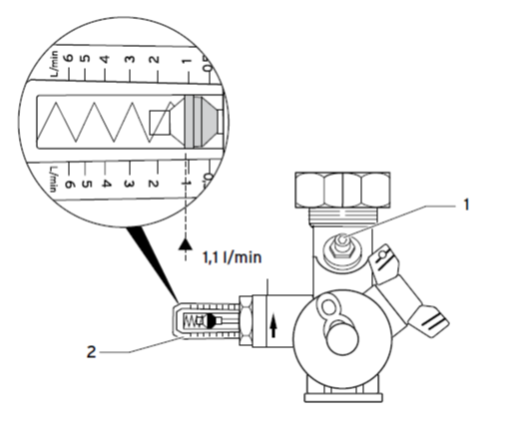 Bei deutlicher Unterschreitung des abgelesenen Volumenstroms wird auf eine größere Pumpenstufe geschaltet. Sollte eine Feineinstellung dennoch vorgenommen werden, so kann dies am Stellventil (1) des Durchflussmengenbegrenzers erfolgen. Den eingestellten Wert können Sie an der Anzeige (2) des Durchflussmengenbegrenzers ablesen (siehe Abb.). Die Skala des Durchflussmengenbegrenzers ist in l/min eingeteilt.