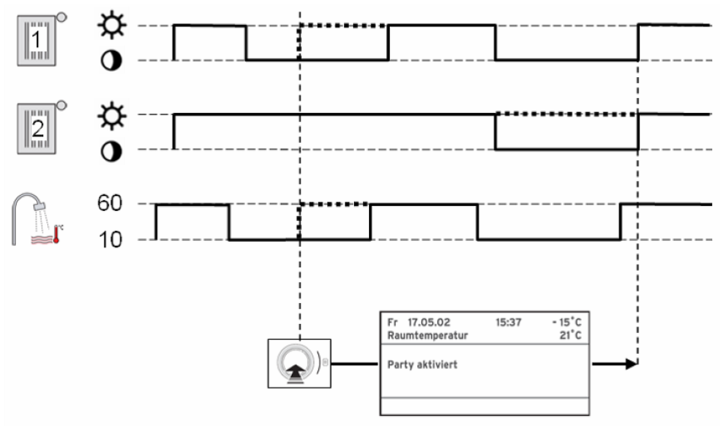 Die Partyfunktion erlaubt es, die Heiz- und Warmwasserzeiten über den nächsten Abschaltzeitpunkt hinaus bis zum nächsten Heizbeginn fortzusetzen. Die gerade aktive oder bevorstehende „Absenkphase“ wird zur „Heizphase“.