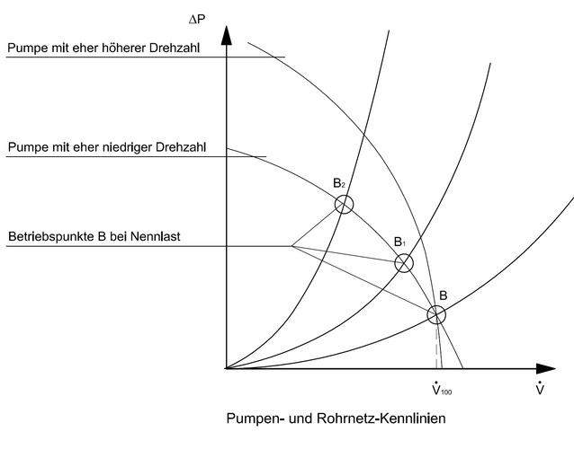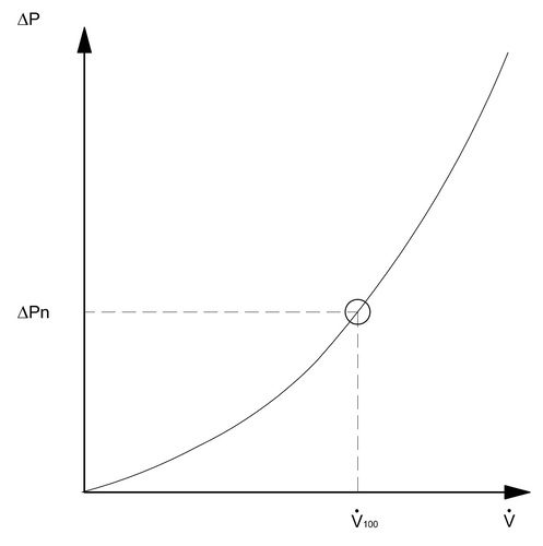 Netzkennlinie: ΔPn = Druckverlust im Leitungsnetz, V100 = Nennvolumenstrom