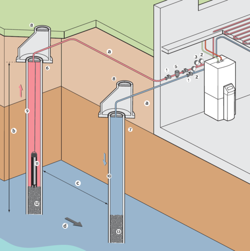 Grundwasser mit Hilfe einer Tauchpumpe der Wärmepumpe zugeführt und über einen Schluckbrunnen wieder in den Boden eingebracht.