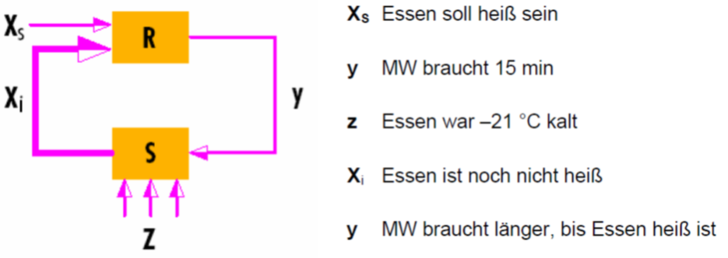 Dieser Vorgang entspricht dem Steuern, die Messgröße hier ist die Zeit, die geänderte Eingangsgröße die Leistung der Mikrowelle, die abgeschaltet wird. Benötigt das Gericht zum Garen aus einem Grund länger, z. B. weil es nicht wie üblich bei –18 °C sondern bei –21 °C aus dem Gefrierschrank genommen und in die MW gestellt wurde, so ist nach 15 Minuten das Gericht im Inneren noch kalt.