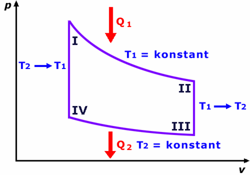 Die unter Druck stehende heiße Luft im Zylinder dehnt sich aus wobei ihr Volumen zunimmt (Expansion). Die Luft verrichtet so Arbeit, indem sie den Arbeitskolben bewegt. Der Druck sinkt. Die Energie dafür wurde ihr zuvor durch die Heizung zugeführt. Das heißt, das die Luft nur ein Energieumwandler ist, jedoch sich ihre eigene Energie bzw. ihre Temperatur T1 nicht ändern (Isotherme).