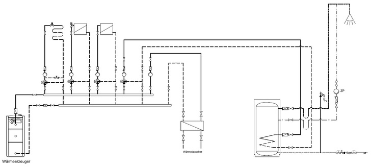 − Wärmeerzeuger und Verbraucher werden parallel in Flussrichtung zwischen Vorund Rücklauf eingezeichnet.
