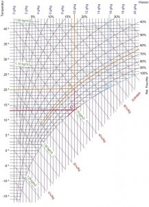 Auf dem ersten Blick verwirrend, kann man nach kurzer Einführung in die Bedeutungen der Linien und Kurven das dahinter stehende Prinzip des Mollier- oder h-x-Diagramms verstehen. Links an der Y-Achse ist die Temperatur aufgetragen. Die X-Achse stellt die Zunahme an Feuchte dar. Diese Feuchte wird als absolute Feuchte bezeichnet und anhand eines Ablesebeispiels kurz erläutert.