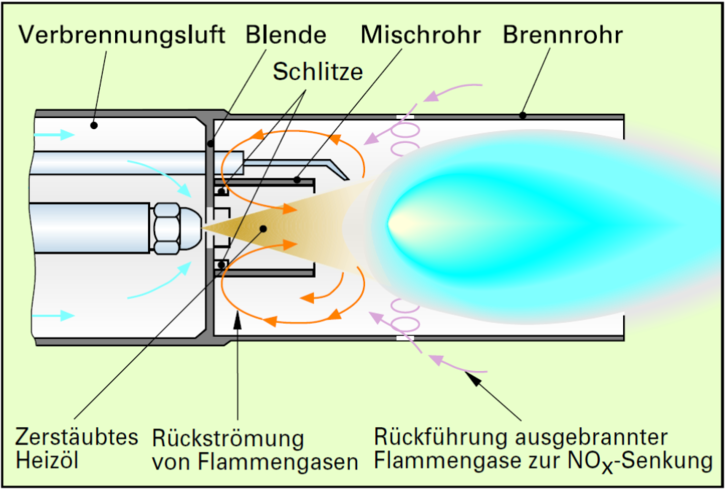 Betrachtet man hingegen einen Öl-Brenner so ist der Kampf der unterschiedlichen Systeme im kleinen Leistungsbereich bis 50kW zugunsten des Blaubrenners entschieden. Hier führen konstruktive Maßnahmen an der Gemischaufbereitung zu der Blauen Flamme. Das Geheimnis scheint also gelöst. Es ist also die Art der Gemischaufbereitung welche die Blaue Flamme entstehen lässt. Dabei entscheidend ist der Anteil der Verbrennungsluftzumischung vor bzw. bei der Flammenentstehung. Der Ölnebel wird sich am Zündfunken entzünden. Für einen kurzen Augenblick scheint die Öl-Flamme Gelb zu brennen. Nun aber greifen die Konstrukteure in die reichlich gefüllte Trickkiste und graben den Venturi aus. Mithilfe dieser genialen Idee werden die heißen Abgase durch einen Rezikulationsspalt durch Unterdruckbildung (negativer Druck) angesaugt. Die heißen Abgase lassen den Ölnebel verdampfen. Die Bindungsfähigkeit des zugeführten Sauerstoffs an den Brennstoff Heizöl nimmt dabei zu weil der Öldampf (Gasförmig) gegenüber dem Ölnebel (Tropfenförmig) eine größere Oberfläche besitzt. Mit dieser Technik verbrennt ein Blaubrenner nahezu CO frei. Zu dem brennt die Flamme unsichtbar in einem Flammenrohr. Dieses Flammenrohr beginnt kurz nach dem Start des Brenners (ca.20 sek.) zu glühen. Dieses Strahlungswärme lässt weniger schädliches NOx entstehen.
