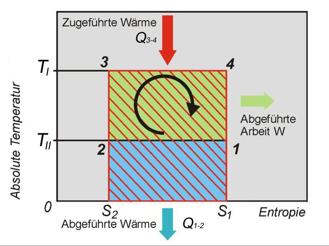 Vergleichbar ist die Wärmepumpen-Funktion mit dem rückwärtslaufenden (idealen) Carnot-Prozess, entspricht also dem Prinzip der Kraft-Wärme-Maschine. Aus dem Carnot-Prozess lässt sich der theoretische Wirkungsgrad (ec) der Wärmepumpe errechnen. Allerdings fällt die Leistungszahl (e) bei einem realistischen Wärmepumpenprozess geringer aus, weil betriebsbedingt thermische, mechanische und elektrische Prozesse sowie der Energiebedarf des Hilfsantriebs die Leistung schmälern. Grundlegend gilt für die Wärmepumpen-Funktion: Je geringer der Unterschied zwischen Temperaturquelle und Wärmeverteilung ist, desto wirtschaftlicher arbeitet eine Wärmepumpe.
