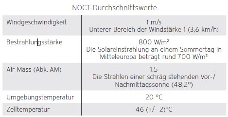 Die Nennleistung jedes Photovoltaik Moduls enthält den zusätzlichen Hinweis "Wp unter STC Bedingungen". Zusätzlich wird der NOCT Wert angegeben. Die Abkürzung NOCT steht für die englische Bezeichnung Normal Operating Cell Temperature. Das bedeutet, die Photovoltaikzelle wird unter Normalbetrieb getestet. Anders als bei den STC-Prüfbedingungen kommen folgende NOCT-Durchschnittswerte zum Einsatz: