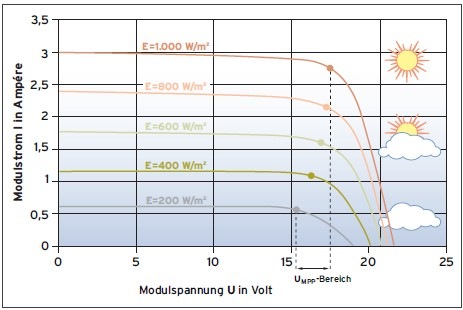 Um den Energieertrag zu optimieren, versucht der Wechselrichter einer PV-Anlage permanent, das unter der aktuellen Einstrahlung und Zelltemperatur optimale Verhältnis aus Strom und Spannung, den so genannten MPP-Punkt (Maximum Power Point) einzustellen.
