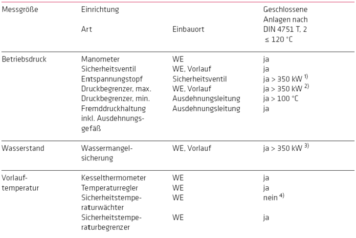 1) Auf einen Entspannungstopf kann auch über 350 kW verzichtet werden, wenn die Anlage ≤ 100 °C abgesichert ist und ein zusätzlicher Sicherheitstemperaturbegrenzer sowie ein zusätzlicher Maximal-Druckbegrenzer installiert sind. 2) Druckbegrenzer ist auch erforderlich bei einer Druckabsicherung über 3 bar. 3) Unter 350 kW kann auch auf andere Weise (z. B. Mindestdruckbegrenzer, Strömungswächter) sichergestellt werden, dass eine unzulässige Erwärmung bei Wassermangel nicht auftreten kann,
