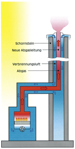 Beim Schornsteinfeger meldet man den Umbau der Anlage zeitig an. Und dieser will auch sofort einige Details wissen. Bei einem Gebäude aus den Achtzigern geht man noch nicht von einem feuchteunempfindlichen Schornstein aus, diese Bauart kam erst in den Neunzigern zum Einsatz. Sie wäre aber auch nicht notwendig gewesen, sorgte doch der Kessel von Hause aus für eine Abgastemperatur über dem Taupunkt. Es bietet sich, für den hier beschriebenen klassischen Fall, die Montage einer Abgasleitung an. Diese wird am besten im Überdruck betrieben und benötigt nur wenig Platz im vorhandenen Abgasweg. Dadurch bleibt zwischen neuer Abgasleitung und altem Abgasweg noch eine recht große Öffnung übrig. Hier lässt sich dann häufig die Verbrennungsluftzufuhr realisieren. Der Betrieb des neuen Wärmeerzeugers würde dadurch raumluftunabhängig. Der Achtziger-Jahre-Kessel war noch raumluftabhängig installiert worden. Das bedeutet, die Verbrennungsluft wurde direkt aus dem Aufstellraum entnommen. Die Nutzung eines solchen Raumes, beispielsweise als Trockenraum für Wäsche, war dadurch natürlich eingeschränkt. Eventuelle Zuluftöffnungen oder gar Schächte ins Freie können beim Betrieb des neuen also Kessels entfallen. Dieser holt nämlich seine Verbrennungsluft oben von der Krone des Schornsteins in den Keller des Hauses. Auf diesem Weg nach unten streift die zukünftige Verbrennungsluft entlang an der warmen Abgasleitung und kühlt diese nochmals runter. Die Verbrennungsluft selbst wird dadurch vorgewärmt, ein positiver Effekt, der zusätzlich die Effektivität der Anlage erhöht.