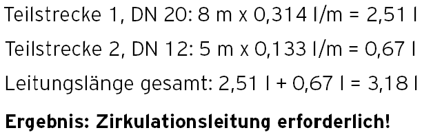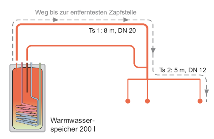 Bei der Ermittlung des Wasserinhaltes ist die Rohrlänge vom Warmwasserspeicher bis zur entferntesten Zapfstelle zu berücksichtigen. Die Prüfung des Wasserinhaltes erfolgt auf der Grundlage der ermittelten Leitungslängen