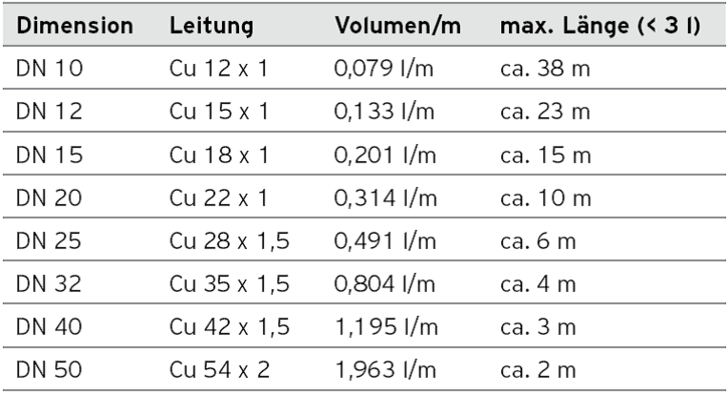 Zirkulationssysteme sind nach DVGW erst bei Anlagen mit mehr als 3 Liter Wasserinhalt in der Warmwasserleitung vorgeschrieben. Wie aus der folgenden Tabelle hervorgeht, sind so theoretisch Leitungslängen von bis zu 38 m möglich,