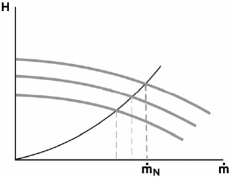 Je mehr Heizungswasser durch die Heizungsanlage fließen soll, desto mehr Druckverluste sind zu überwinden. Die grauen Kurven geben die physikalischen Möglichkeiten einer 3-stufigen Pumpe wieder. Jede dieser 3 Pumpen-Kennlinien schneidet die Anlagenkennlinie. So können sich bei dieser Pumpe und dieser Anlage drei verschiedene Betriebspunkte ergeben.