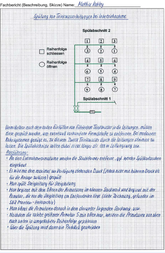 Vor Inbetriebnahme einer Trinkwasseranlage sind die Leitungen zu spülen und einer Dichtheitsprüfung zu unterziehen. Werden Trinkwasserleitungen aus Kupferrohren Weich- oder auch Hartgelötet so müssen diese Leitungsteile nach Fertigstellung intermittierend gespült werden. Das bedeutet, dass diese mit einem Luft-Wasser-Gemisch zu durchströmen sind. Dazu muss filtriertes Trinkwasser aus der Versorgungsleitung benutzt werden. Abschließende Dichtheitsprüfungen sind durchzuführen bevor die Rohre verdeckt (eingemauert, verputzt o. ä.) sind. Hierzu werden die Rohrleitungen mit filtriertem Wasser gefüllt. Die Leitungen werden dann vollständig entlüftet und auf Prüfdruck gebracht. Dieser Druck muss dem 1,5-fachen des zulässigen Betriebsüberdruckes entsprechen. Beträgt der Temperaturunterschied zwischen dem eingefüllten Wasser und der Rohrleitung mehr als 10 K, sollte eine Wartezeit von 30 Minuten folgen. Bei der anschließenden Prüfdauer von zehn Minuten dürfen sich kein Druckabfall und natürlich auch kein Leck zeigen.