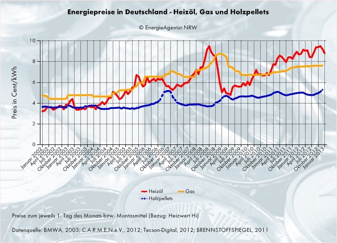 Die zur Herstellung der Pellets notwendige Energie aus beispielsweise trockenen Sägespänen ist im Vergleich zur Bereitstellung von Erdgas oder Heizöl gering. Der Energieaufwand zur Bereitstellung von Pellets beträgt ca. 3 % der Endenergie, bei Erdgas dagegen 10 % und bei Heizöl sogar 12 %. Kommen feuchte Sägespäne oder Waldrestholz zum Einsatz, steigt der Energieaufwand aufgrund des höheren Wassergehaltes auch bis zu 17 %. Man bedenke dabei dass es sich ansonsten um ein CO2-neutrales Brennmaterial handelt, nicht so, wie bei Erdgas und Öl. Im Vergleich zu Gas und Öl ist das Transport- und Lagerrisiko auch entsprechend gering. Oder hat jemand schon mal von einer Pelletspest vor der deutschen Küste gehört? Für den Endverbraucher von Pellets kann es auch ein Anreiz sein die regionale Wirtschaft zu stützen statt Ölfelder von Soldaten bewachen zu lassen. Letztlich ist aber der Preis ein wesentlicher Anreiz zur Verwendung von Pellets als Energielieferant. Der Preis der konkurrierenden Brennstoffe (bezogen auf die Kilowattstunde an Energie) beschreibt in den letzten sieben Jahren eindeutig die hervorragenden Marktverhältnisse für Pellets.