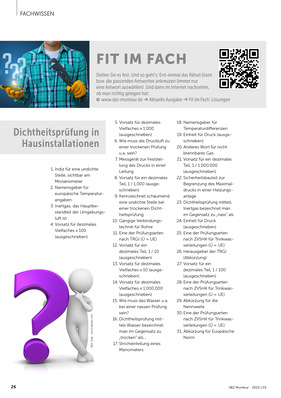 28.11.2019 | Veröffentlicht in Ausgabe 12-2019 | Druckvorschau Stellen Sie es fest. Und so geht’s: Erst einmal das Rätsel lösen bzw. die passenden Antworten ankreuzen (immer nur eine Antwort auswählen). Und dann im Internet nachsehen, ob man richtig gelegen hat: www.sbz-monteur.de ➔ Aktuelle Ausgabe ➔ Fit im Fach: Lösungen