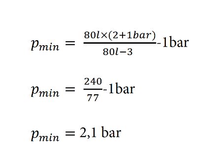 Den Druck, um genau diese Menge ins Gefäß zu bringen kann man exakt ausrechnen. Und dieser Fülldruck ist natürlich abhängig von der Größe des Gefäßes. Ein Gefäß mit 20 Liter Volumeninhalt weist bei einer 3-Liter-Wasservorlage einen höheren Druckanstieg auf als eines mit 80 Liter. Für dieses Beispiel steigt der Druck im 20-Liter-Gefäß auf 2,5 bar und im 80-Liter-Gefäß nur auf 2,1 bar