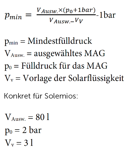 pa = bezeichnet den Fülldruck der Anlage. In kleinen Anlagen, wie bei den Solemios, soll dieser mindestens 2 bar betragen. Ansonsten richtet sich dieser nach der statischen Höhe plus