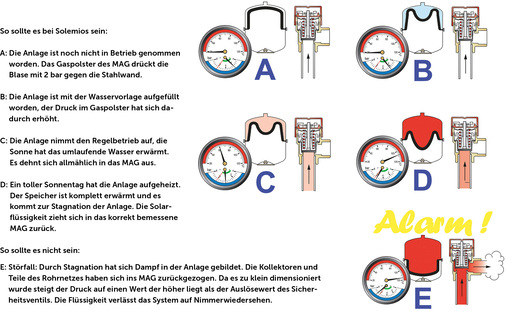 Anhand der Beschreibung des Wohnhauses der Familie Solemio konnten Sie schon erahnen, dass der Weg vom Kollektor zum MAG für eine ausreichende Kühlung der durch Dampf vertriebenen Solarflüssigkeit sorgt. Das heißt, im Kollektor entsteht bei Stagnation an einer Stelle eine Dampfblase und schiebt das noch flüssige Fluid der Rohrleitungen ins MAG.