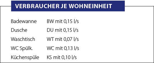 Die Addition der geforderten Volumenströme ergibt zusammen 0,6 l/s (Liter pro Sekunde). Das klingt sehr abstrakt ist aber in der Realität ein satter Strahl (drei Trinkgläser pro Sekunde können gefüllt werden). Wollte man also diesen satten Strahl zu den Einheiten befördern, so käme man bei zehn Wohneinheiten auf einen Volumenstrom von 6 l/s. Diesen errechneten Wert bezeichnet man als Summenvolumenstrom.