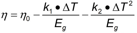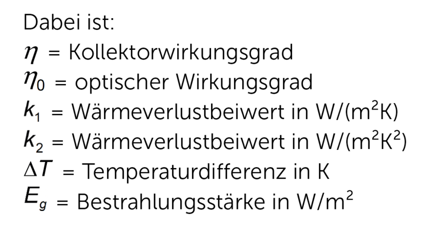 Man unterscheidet für Kollektoren allgemein drei Einflussfaktoren auf den jeweiligen Wirkungsgrad. Einer dieser Einflüsse ist unabhängig von der Umgebungstemperatur. Dies betrifft den so genannten optischen Wirkungsgrad. Gemeint ist damit der Anteil des Sonnenlichts der durch die schützende Glashülle zum Absorber dringt. Werte für moderne Flachkollektoren liegen meistens etwas höher als für Röhrenkollektoren. Dies resultiert, wie bereits beschrieben, aus der Tatsache, dass das energiereiche Licht beim FK einmal und beim VRK zweimal das Glas durchschreiten muss. Als weitere Größe ergibt sich eine Verlustleistung des Kollektors bei seiner Erwärmung. Diese nimmt naturgemäß mit steigender Temperaturdifferenz zur Umgebung zu. Ein Teil dieser Wärme wird durch Konvektion ein anderer durch Strahlung abgegeben. Man unterscheidet daher zwei so genannte Wärmeverlustbeiwerte, nämlich k1 und k2 (herstellerabhängig auch a1 und a2). Die Formel zur Ermittlung des gesamten Kollektorwirkungsgrades berücksichtigt daher diese drei Einflüsse gemäß folgender Formel: