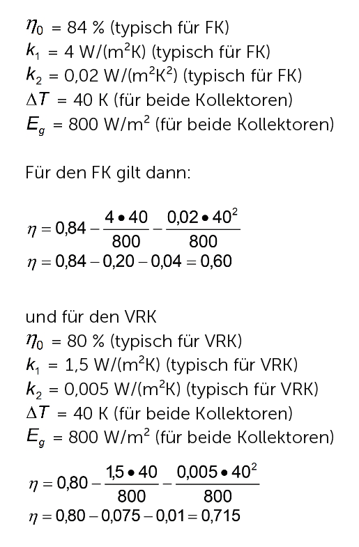 Ein Beispiel soll die Zusammenhänge kurz rechnerisch verdeutlichen. Dabei wird bei ansonsten gleicher Einstrahlung und Temperaturdifferenz für den FK dem VRK gegenübergestellt. Ausgangslage ist ein sonniger Tag mit 20 °C Außentemperatur, während der Kollektor bereits auf 60 °C aufgeheizt ist. Der Lorenz knallt mit 800 W/ m².
