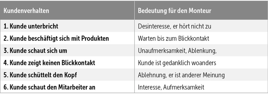 Kunden senden auch Signale mangelnder Aufmerksamkeit. Wer wegschaut, den Blickkontakt meidet, ist nicht voll bei der Sache. An Fragen und Kommentaren des Kunden lässt sich feststellen, ob er verstanden hat.