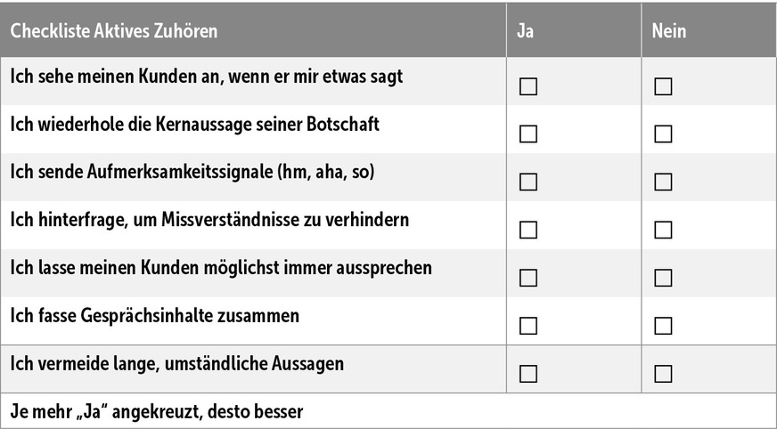 Passives Zuhören beschränkt sich nur auf die Informationsaufnahme und ist für den Kunden nicht erkennbar. Beim aktiven Zuhören hingegen sendet der Zuhörer Zeichen des Verstehens, z. B. Blickkontakt und Nicken. Die gesendeten Informationen werden jedoch noch nicht bewertet, sondern nur aufgenommen.