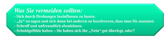 Fürchten Sie, das Wohlwollen Ihres Kunden zu verlieren, wenn Sie seinen Wunsch ablehnen? Dann wird Ihnen ein „Nein“ immer schwerfallen. Wer es verlernt hat nein zu sagen, kann nichts mehr durchsetzen. Viele Kunden wollen die Grenze finden, testen einfach, wie weit sie mit ihren Forderungen gehen können, besonders wenn es um Termine geht. Würden Sie immer zustimmen, dann wachsen die Ansprüche weiter und Ihre Kunden fordern immer mehr.