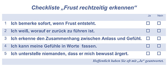 Die Früherkennung von Frust ist entscheidend für den weiteren Verlauf. Denn Sie können nur in einem frühen Stadium des Gefühls entscheiden, wie Sie damit umgehen. Die Kompetenz, auf die eigenen Gefühle Einfluss zu nehmen, muss man sich immer wieder bewusst machen. Ärger ist nicht grundsätzlich etwas Schlechtes, sondern ein Hinweis, dass etwas für Sie nicht in Ordnung ist. Das kann man auch positiv aufnehmen und überlegen, wie man mit dem Ärger umgeht, anstatt sich der Dynamik des Ärgers auszuliefern. Das Denken verläuft langsamer als die Dynamik der Gefühle und daher muss man für eine „Entschleunigung“ sorgen. Wenn Sie feststellen, dass Wut entsteht, aktivieren Sie Ihren Verstand mit dem Auftrag, die Situation kurz zu checken. Damit laufen Sie dem Ärger nicht in die Falle. Denken Sie z. B. „Aha, das ist jetzt eine ärgerliche Situation, wenn ich nicht aufpasse, explodiere ich, was mache ich jetzt?“ Die gedankliche Verarbeitung des Reizes, der die Emotionen ausgelöst hat, ist entscheidend für die weitere Entwicklung des Gefühls. Bei nahendem Ärger kann man auch relativieren, differenzieren oder im besten Fall sogar Entwarnung geben.