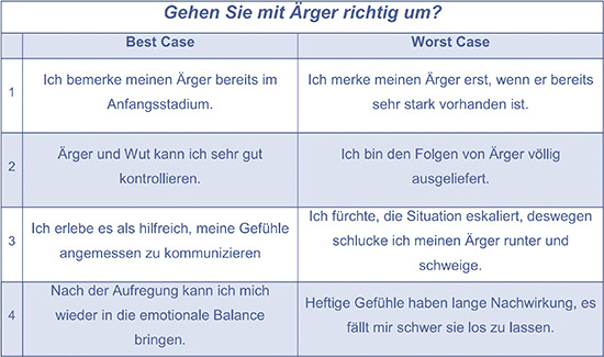 Sie nehmen Ihren Ärger wahr und regulieren ihn durch das „Chairperson-Prinzip“. Nach diesem Prinzip denken Sie in einer ärgerlichen Situation: „Ich mache mir die Aufregung sofort bewusst und entscheide mich selbst, ob ich mich ärgern will.“ Dadurch behalten Sie die Kontrolle und lassen nicht zu, dass ein anderer oder eine ärgerliche Situation über die eigenen Gefühle bestimmt. Es ist besser die Gefühle durch Selbstgespräche zu steuern. Man kann sich genauso gut entscheiden, sich nicht zu ärgern. Funktioniert dieses Prinzip nicht, wird der Ärger ausgesprochen, einem Kollegen mitgeteilt. Geteilter Ärger ist halber Ärger.