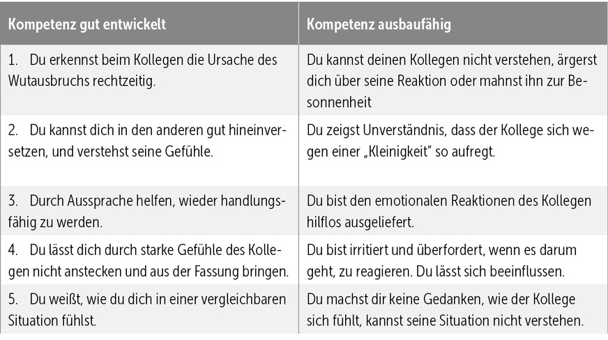 Der friedliche Kollege Markus, beliebt und im Team voll integriert, rastet aus, wenn ihm was nicht passt, z.B. die Arbeitseinteilung des Chefs, Terminverschiebung trotz exakter Planung oder Sonderwünsche des Kunden. Dabei ist der Unterschied wichtig: Richtet sich der Fluch gegen eine Sache oder gegen eine Person? Du kannst dich daran gewöhnen, dass jemand im Team unbeherrscht ist: „Der ist halt so, aber sonst ganz o.k.“. Willst du den Kollegen, der tobt verstehen, musst du seinen Standpunkt einnehmen. Einen Wutausbruch, für den du kein Verständnis hast, wirst du auch von einem lieben Kollegen nicht hinnehmen. Ausrasten ist nicht gerade ein Zeichen von Disziplin, denn wer laut ist, hat die Kontrolle über sich verloren. Beruhige deinen Kollegen. Besser, du gibst im Recht für seine Aufregung, für seine Reaktion, wenn etwas nicht klappt: „Da würde ich auch ausrasten, wenn mir das passiert.“ Allerdings – gibst du ihm Recht, wird er jedes Mal zu dir kommen und sich abreagieren.