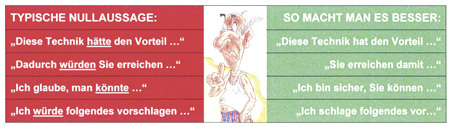 Die Möglichkeitsform im Kundengespräch wirkt unsicher. Wer sicher wirken will, spricht in der Wirklichkeitsform. Denn durch „würde, wäre, hätte, könnte, müsste“ verunsichert man den Kunden. Die Möglichkeitsform ist die Höflichkeit der 80-er Jahre. „Eigentlich kann ja nichts schief gehen“, „Wir sind wahrscheinlich in der Lage“. Diese Formulierungen brechen der Aussage die Spitze ab, relativieren sie zu einer Null-Aussage. Deshalb: Auf den Müll mit „eigentlich“, „vielleicht“, „eventuell“, „einigermaßen“, „möglicherweise“ und ähnliche Verbal-Pölsterchen. Zumindest dort, wo Kompetenz und Standing=(Eier) sowie persönliche Durchsetzungsfähigkeit auch sprachlich gefragt ist. Dazu gehören die Konjunktiv-Aussagen wie „es könnte sein“, „wir würden gerne“, „es wäre gut“.