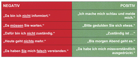 Ein gewisses Maß an Sprachhygiene ist erforderlich, wenn man mit Kunden redet. Sprach-Schlampereien lösen keine Handlung aus und verunsichern den Kunden. Wer Sicherheit und Kompetenz ausstrahlen muss, drückt sich eindeutig und klar aus. Kunden mögen keine butterweichen Aussagen.