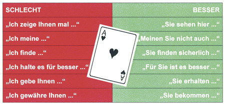 Ohne groß zu überlegen wird drauflos geredet. Als wenn es nicht positive und negative Worte gibt. Haben Sie schon mal bewusst darauf geachtet? Jeder kennt den Unterschied zwischen einem halbvollen und halbleeren Glas. Der Optimist freut sich, dass sein Glas ja noch halb voll ist - ihn also noch 50 Prozent Genuss erwarten. Der Pessimist ist traurig darüber, dass er schon die Hälfte seines Getränks vertilgt hat und im jetzt nur noch schäbige 50 Prozent übrig bleiben. Worte wecken Gefühle, beeinflussen das Gesprächsklima. Negatives lässt sich positiv ausdrücken. Und das sollte man auch tun. Im Beratungsgespräch stellt man sein Leistungspaket dar. Man kommt also ganz schön ins Reden. Sprechen Sie so, dass es Vergnügen macht, Ihnen zuzuhören. Fachwörter verstehen nur Fachleute und der Kunde dann nur Bahnhof. Am Besten ist es, wenn ein Kundengespräch ohne spezielle Begriffe auskommt. Was für den Fachmann eine Entnahmearmatur mit integrierter Sicherungskombination und Schlauchanschluss ist, ist für den Kunden eben schlicht ein „Zapfhahn“ - was soll’s? Und sind Fachbegriffe einmal nicht zu umgehen, sollte die Erklärung, was sie bedeuten, nicht auf sich warten lassen. Auch auf umständliche, lange Sätze, die mit Nebensätzen verlängert werden, sollte man verzichten. Das verwirrt sonst den Kunden.