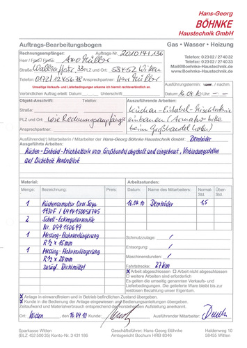 Die Arbeit geht leicht von der Hand, die neue Küchenspülen-Armatur ist schnell eingebaut und angeschlossen. Ratz-Fatz gemacht, Profiarbeit eben. Und dann kommt der Punkt, den so mancher Monteur überhaupt nicht mag: Er muss den oft so genannten „Arbeitszettel“ ausfüllen, also den Papierkram erledigen. Welches Material eingebaut wurde, welche Hilfsstoffe nötig waren, wie lange die Arbeit gedauert hat, usw. Um die ungeliebte Schreiberei hinter sich zu bringen, fasst man sich oft kurz - die im Büro werden schon wissen, was gemeint ist!