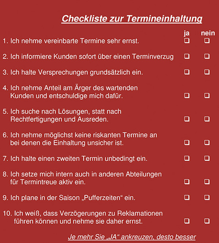 Eine Verzögerung ist aus Sicht des Kunden eine Reklamation, auch wenn der Handwerker das anders sieht. Wer erst mal reklamiert, sucht dann nach weiteren Anlässen seiner Unzufriedenheit: der Preis ist zu hoch, die Montage dauert zu lange, Schmutz wurde nicht ganz beseitigt. Der Monteur sollte daher auf dem Montagebericht einen Vermerk über die Unzufriedenheit machen, damit der Chef später noch Stellung nehmen kann. Es hat sich bewährt, dem Kunden die Notiz anzukünden damit er sich ernst genommen fühlt. Mitarbeiter sollten Terminverzug als Reklamation wahrnehmen und nicht verniedlichen. Die innere Einstellung „Es gibt Schlimmeres“ ist jedenfalls nicht kundenorientiert und führt dann auch zu einer falschen Äußerung. Es ist immer eine Frage der Perspektive: Für den Mitarbeiter ist eine Verzögerung vielleicht ein Normalfall, für den Kunden ein Ärgernis. Wer sich in die Lage des Kunden versetzen kann, wird besser reagieren.