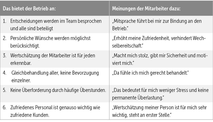 Zufriedenheit des Monteurs ist das Mindestziel, das Maximal-Ziel wäre die Begeisterung. Dazu gehören vor allem Lob und Anerkennung für besondere Leistungen, auch wenn manche meinen, der Betrieb sei kein Streichelzoo. Die meisten Arbeitgeber haben die Situation erkannt und binden ihr Team durch intensive Beziehungspflege.