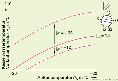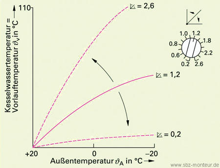 Der Standard in Wohngebäuden ist heute die Kombination von außentemperaturgeregelten Wärmeerzeugern in Verbindung mit Thermostatventilen an jedem Heizkörper. Bei dieser Regelung werden ein Außenfühler und ein Vorlauffühler eingesetzt. Der Außenfühler wird wind- und sonnengeschützt mindestens zweieinhalb Meter über der Geländeoberfläche angebracht. Er muss dabei einen ausreichenden Abstand zu Fenstern und Türen haben. Schließlich soll die beim Lüften entweichende Wärme am Fühler keine Frühlingsgefühle auslösen. Regelgröße ist die Vorlauftemperatur, die in Abhängigkeit von der Witterung einreguliert wird. Als Führungsgröße für den Vorlauftemperatur-Sollwert wird die Außentemperatur verwendet. Der Regler fordert so lange Wärme vom Kessel an, bis die Vorlauftemperatur zur Außentemperatur passt. Jeder Außentemperatur ist eine bestimmte Vorlauftemperatur zugeordnet. Diese Zuordnung wird durch die Reglerkennlinie vorgegeben und muss U an die Verhältnisse in der Heizungsanlage angepasst sein. Diese sind mit der so genannten Heizkurve beschrieben. Es gibt unterschiedlich steile Heizkurven. Unter der Steilheit versteht man das Verhältnis der Vorlauftemperaturänderung zur Außentemperaturänderung. Die Auswahl der richtigen Heizkennlinien-Steilheit ist ein entscheidendes Kriterium für die einwandfreie Funktion einer witterungsgeführten Vorlauftemperaturregelung.
