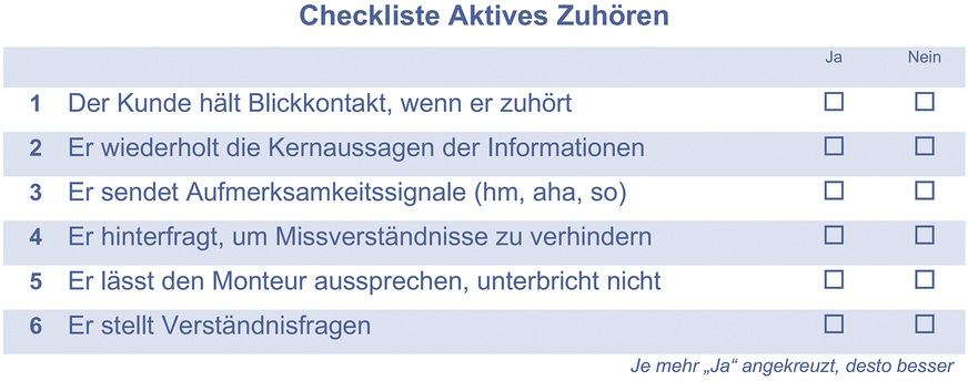 Schön, wenn der Monteur dem Kunden gut zuhört, sich bemüht mit voller Aufmerksamkeit die Botschaften zu erfassen. Aber es kommt auch darauf an, dass der Kunde aufmerksam zuhört, wenn der Monteur ihm etwas mitteilt. Zuhören ist für Kunden schwierig, strengt an, ist aber wichtig, wenn es um die Weiterleitung von Informationen geht.