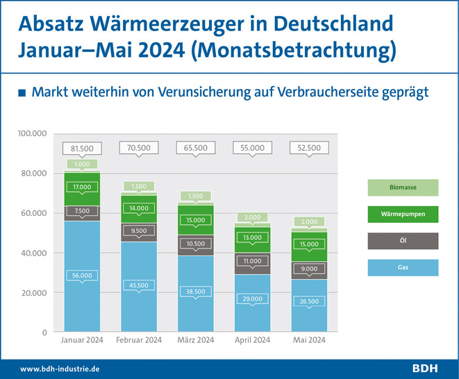 Der Markt für neue Heizungen kommt weiterhin nicht in Schwung. Insgesamt setzten die Hersteller bis einschließlich Mai diesen Jahres 39 Prozent weniger Wärmeerzeuger ab als noch im Vorjahreszeitraum. Das geht aus der Absatzstatistik hervor, die der Bundesverband der Deutschen Heizungsindustrie (BDH) heute vorgelegt hat. „Die letztjährige Debatte um das Gebäudeenergiegesetz wirkt bei den Menschen nach. Die Verunsicherung in Punkto Heizungsmodernisierung ist immer noch groß” erklärt BDH-Hauptgeschäftsführer Markus Staudt die aktuelle Marktsituation. Zudem sei nach Auffassung des Verbandes bei den Menschen noch zu wenig bekannt, welche technischen Lösungen das Gesetz zulässt. Gleiches gilt für die neu ausgerichtete Förderung.