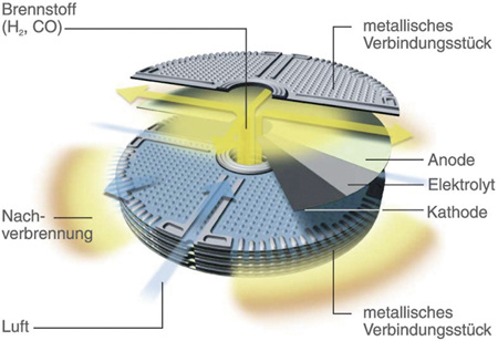 Eine Brennstoffzelle allein wird kaum erfreuliche elektrische Spannungen erzeugen. Mit 0,8 Volt einer einsamen Brennstoffzelle lassen sich vielleicht Hörgeräte betreiben. Um aber den Toaster in der Küche zum Glühen zu bringen braucht es mehr als dieses winzige Signal. Dazu werden in der Praxis viele hunderte Brennstoffzellen hintereinander geschaltet. Ein „Stapel“ dieser Zellen wird im englischen zu „stack“ und hat sich im Sprachgebrauch der Fachleute für eine Ansammlung von Zellen etabliert. Je nach Bedarf wie zum Beispiel Hörgerät, Handy, Laptop oder Auto, werden entsprechend viele Zellen zu einem Stack vereinigt. Ein solches Flüsterkraftwerk hätte mit diesen Eigenschaften schon lange Einzug halten müssen in die Haushalte der Nationen. Also wo ist der Haken?