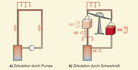 Ein Blick in die Vergangenheit lässt vermuten, dass die Zirkulationspumpe nicht ständig fördern muss. Denn schließlich gab es früher die so genannte Schwerkraft-Zirkulation. Sie kam ganz ohne Pumpe aus und machte sich den Dichteunterschied des warmen und kalten Wassers zunutze. Das warme Wasser mit geringerer Dichte stieg quasi freiwillig in der Steigleitung nach oben. Dafür sorgte auch das schwerere, abgekühlte Wasser, das in der Zirkulationsleitung wieder nach unten drückte. Damit das funktionierte, musste das Wasser aber abkühlen. Hier wurde also ohne Ende Energie verschleudert. Schlimmer noch: In dem nur noch lauwarmen „Rücklaufwasser“ fühlten sich auch Legionellen sehr wohl.
