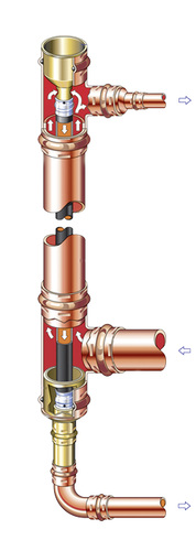 Allerdings trügt hier dieser Schein. Im DVGW-Arbeitsblatt W 551 [2] wird gefordert, dass Zirkulationsleitungen so zu dimensionieren und Pumpen so geregelt werden müssen, dass die Differenz zwischen Speicheraustrittstemperatur und Temperatur des rückläufigen Zirkulationswassers nicht größer als 5 K ist. Folglich muss die Zirkulationspumpe nur dann fördern, wenn eine Abweichung von dieser Vorgabe droht. Um dies zu ermöglichen muss der Kunde in eine temperaturgesteuerte Pumpe investieren. Allerdings hat auch diese Sache einen Haken. Besonders bei älteren Anlagen entspricht die Dämmung der Rohrleitung nicht an jeder Stelle des Systems den gesetzlichen Anforderungen. Da, wo man eben nicht so gut hinlangen konnte, ist vielleicht auch die Wärmedämmung etwas spärlicher ausgefallen - Hand aufs Herz: Wer hat sich nicht schon mal vor „fummeligen“ Arbeiten gedrückt? Schaltet die Pumpe temperaturbedingt ab, können an den nicht so gut gedämmten Leitungsstellen die Temperaturen auch unter 55 °C abfallen. Ein Legionellenproblem kann hier möglicherweise seinen Ursprung finden. Eine temperaturgesteuerte Pumpe ist folglich nicht grundsätzlich die richtige Wahl. Es kommt eben auf die Anlage an. Zirkulation bedeutet in der Regel die Notwendigkeit einer zweiten Leitung. Und die benötigt nun einmal Platz. Eine in dieser Hinsicht sparsame Ausführung stellt die Rohr-In-Rohr-Zirkulation dar. Hinzu kommt bei diesem System der Vorteil, dass der Wärmeverlust des „Rücklaufs“ direkt vom Warmwasser wieder aufgenommen wird. Aber auch bei diesem System stellt sich ein hygienischer Nachteil heraus: Das Rohr im Rohr vergrößert die benetzte Oberfläche und damit den Platz für Biofilm um rund 30 Prozent. Hinzu kommt die Gefahr einer Verstopfung des Ringspaltes zwischen dem inneren und dem äußeren Rohr bei harten Wässern.