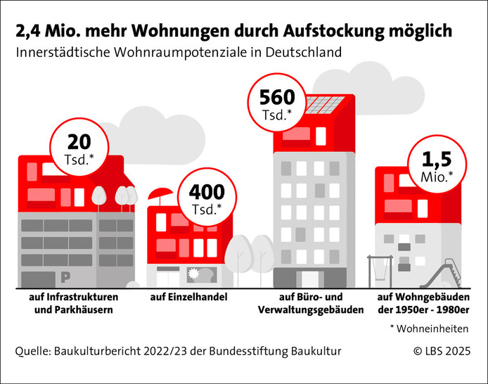 Aktuelle Analysen zeigen erhebliches Potenzial für zusätzlichen Wohnraum durch Umbau und Erweiterung oder eine effizientere Nutzung vorhandener Flächen. Laut Umfragen der Bundesstiftung Baukultur bewerten mehr als 80 Prozent der Bevölkerung den Erhalt und Umbau von Bestandsimmobilien positiv, sie verbinden mit dem Begriff „Umbau“ Erneuerung und Verbesserung. Speziell nach geeigneten innerstädtischen Orten für Nachverdichtungen gefragt, waren fast 90 Prozent der Befragten zum Baukulturbericht 2024/25 der Ansicht, dass neue Wohnungen durch den Umbau von nicht genutzten Büroflächen geschaffen werden sollten.