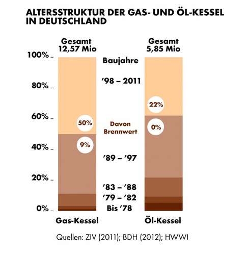 Veraltete Heiztechnik: „Die Modernisierung häuslicher Wärmeerzeuger liegt seit 2007 bei nur etwa 3 % pro Jahr. Hält das geringe Modernisierungstempo an, wird ein Großteil der Heizungen im Jahr 2030 über 30 oder gar 40 Jahre alt und entsprechend ineffizient sein. Dabei sind von den aktuell 21,3 Mio. Wärmeerzeugern schon 2,7 Mio. über 25 Jahre alt. So befänden sich im Heizungsbestand heute noch rund 2,5 Mio. Gas- und Öl-Standardkessel, obwohl sie seit etwa 15 Jahren nicht mehr eingebaut werden dürften.