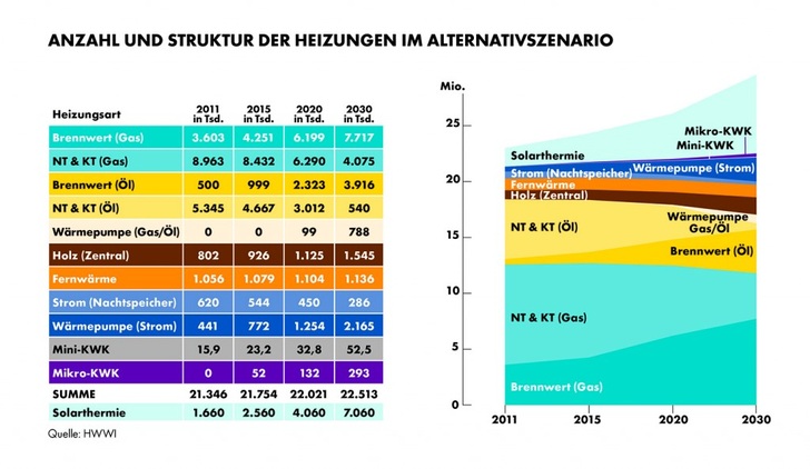 Diversifizierung Heiztechnik und Energieträger: Von den heute 21,3 Mio. Wärmeerzeugern in Wohngebäuden sind 18,4 Mio. bzw. 86 % Gas- oder Öl-Heizkessel. Dennoch werden sich im Trend die Heiztechnik und damit auch die Heizenergieträger bis 2030 zunehmend diversifizieren. Die Zahl alternativer bzw. erneuerbarer Wärmeerzeuger – wie Wärmepumpen, Kraft-Wärme-Kopplung (die gleichzeitig Strom und Wärme erzeugt), Holzfeuerungen – wird sich von heute weniger als 3 Mio. auf 6,3 Mio. mehr als verdoppeln. Die Zahl der Solarwärmeanlagen könnte sich von heute 1,6 Mio. auf über 7 Mio. fast verfünffachen.