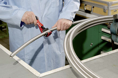 Bislang beschränkte sich der Einsatzbereich der Edelstahlschläuche in der Gasinstallation auf die Funktion einer beweglichen Verbindung. Mit einer solchen werden im Bereich des Gas-Hausanschlusses Bewegungen abgefangen oder der Geräteanschluss erleichtert. Mit der DIN EN 15266 [8] sind nun Anforderungen an Wellrohrleitungen aus nichtrostendem Stahl für den Einsatz in Niederdruckleitungen (Betriebsdruck bis 100 mbar) formuliert. Und wie das Wort „Rohrleitung“ schon vermuten lässt, muss es hier nicht bei einem kurzen Stück Flexibilität bleiben. Geliefert werden die Wellrohre künftig „auf Rolle“. Die Längen sind dabei herstellerspezifisch und natürlich auch von der Nennweite abhängig. Vor Ort wird das Rohr mittels eines Rohrabschneiders abgelängt und danach mit einem Stauchgerät Rohrwellen zu einer Dichtfläche geformt. Mittels einer Überwurfmutter wird die Rohrverbindung hergestellt. Da das Wellrohr ohne Werkzeuge von Hand sogar mit engen Radien gebogen werden kann, eignet es sich als Leitung für knifflige Installationssituationen innerhalb eines Gebäudes.