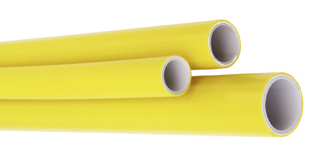 Neu ist die Möglichkeit, Innenleitungen aus Kunststoffrohren zu erstellen. Da wäre zum einen das vernetzte Polyethylen-Rohr (PE-X) entsprechend DVGW VP 624 [9] zu nennen, ein Material, das sich im Bereich der Trinkwasserinstallation und der Fußbodenheizung schon seit Jahrzehnten bewährt. Ferner kann auch ein Verbundrohr aus PE-X / Al / PE-X entsprechend DVGW VP 632 [10] eingebaut werden. Das Verbundrohr besteht genau genommen aus fünf Schichten. Die Außenschicht stellt ein Rohr aus vernetztem Polyethylen dar. Es folgt ein Haftvermittler, der das Außenrohr auf dem Aluminiumrohr fixiert. Über einen weiteren Haftvermittler wird dann die Verbindung zum Innenrohr aus vernetztem Polyethylen hergestellt. Dank des Aluminiumrohres ist das Verbundmaterial nicht nur diffusionsdicht sondern bringt für die Verarbeitung recht komfortable Biegeeigenschaften mit sich. Was fehlt, sind ausreichende thermische Eigenschaften für den Brandfall. Da die Kunststoff- und Verbundrohre selbst keine ausreichende Sicherheit im Brandfall bieten, dürfen sie nur systemisch installiert werden. Dann sorgen thermisch auslösende Absperrvorrichtung und Gas-Strömungswächter dafür, dass eine Inneninstallation aus nichtmetallenen Rohren im Brandfall kein Problem darstellt, wenn das System ausschließlich im Niederdruckbereich betrieben wird. Die Kunststoff- und Verbundrohre nach VP 632 / VP 624 sind - wie beschrieben - für die Innenleitungen gedacht. Allerdings gibt es hier eine Ausnahme: Soll auch im Garten noch die eine oder andere Gasentnahmestelle (z. B. für einen Gas-Grill oder einen Gas-Dunkelstrahler) eingerichtet werden, dann darf die erdverlegte Zuleitung dahin ebenfalls mit diesen Rohrmaterialien ausgeführt werden. Auf diese Weise wird für ein Gebäude eine Gasinstallation aus nur einem Rohrmaterial möglich. Während diese Kunststoff- und Verbundrohre also nur eingeschränkt als erdverlegte Leitung in Frage kommen, sind Kunststoffrohre aus Polyethylen und vernetztem Polyethylen entsprechend DVGW-Arbeitsblatt GW 335 [11] und DVGW VP 640 [12] ausschließlich für die Erdverlegung gedacht.