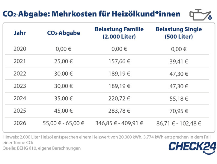 Die CO2-Abgabe wirkt sich auf die Gas- und Heizölkosten für Verbraucher*innen aus. Das zeigen aktuelle Berechnungen von CHECK24. Für das Jahr 2023 muss eine Musterfamilie mit einem Verbrauch von 20.000 kWh jährlich 128,40 Euro CO2-Abgabe aufbringen. Ein Singlehaushalt mit einem Verbrauch von 5.000 kWh im Jahr hat zusätzliche Kosten von 32,10 Euro. Aktuell kostet eine Kilowattstunde Gas laut dem CHECK24-Gaspreisindex 11,7 Cent. Die CO2-Abgabe verteuert die Heizkosten um fünf Prozent. Bis 2026 steigt der CO2-Preis schrittweise bis auf maximal 65 Euro pro Tonne an. Dadurch wird die Abgabe für eine Musterfamilie mit einem Verbrauch von 20.000 kWh auf maximal 309,40 Euro steigen. Die Gaskosten für die Musterfamilie erhöhen sich so voraussichtlich um 13 Prozent.